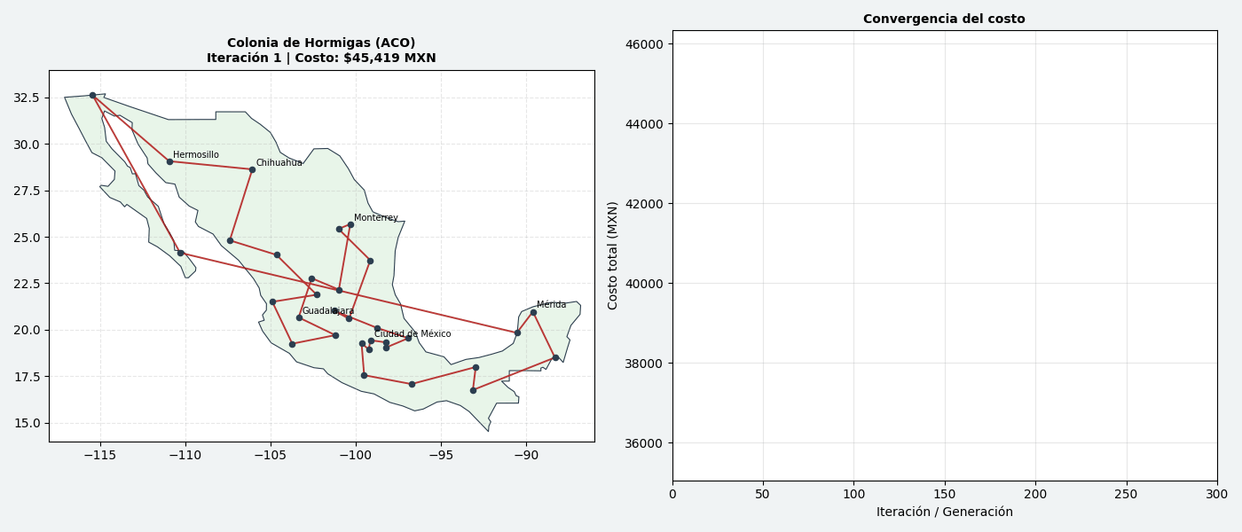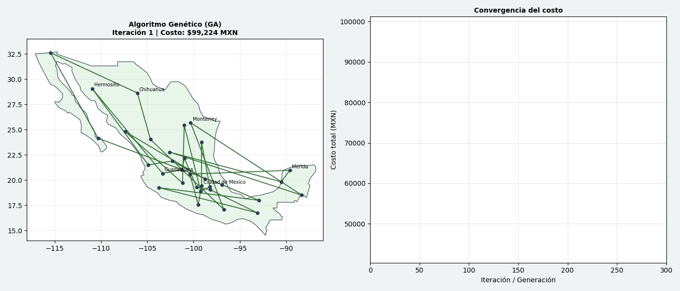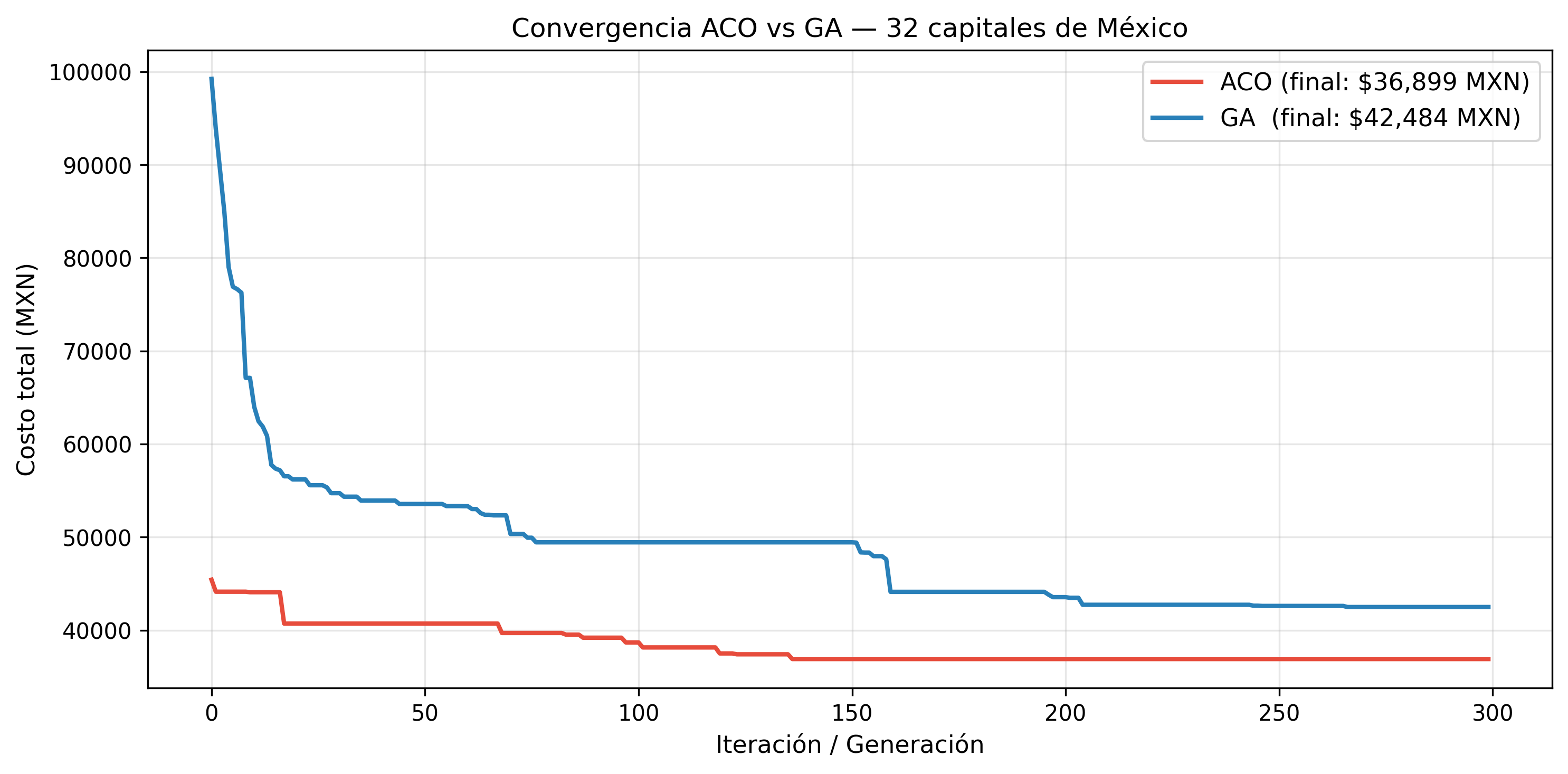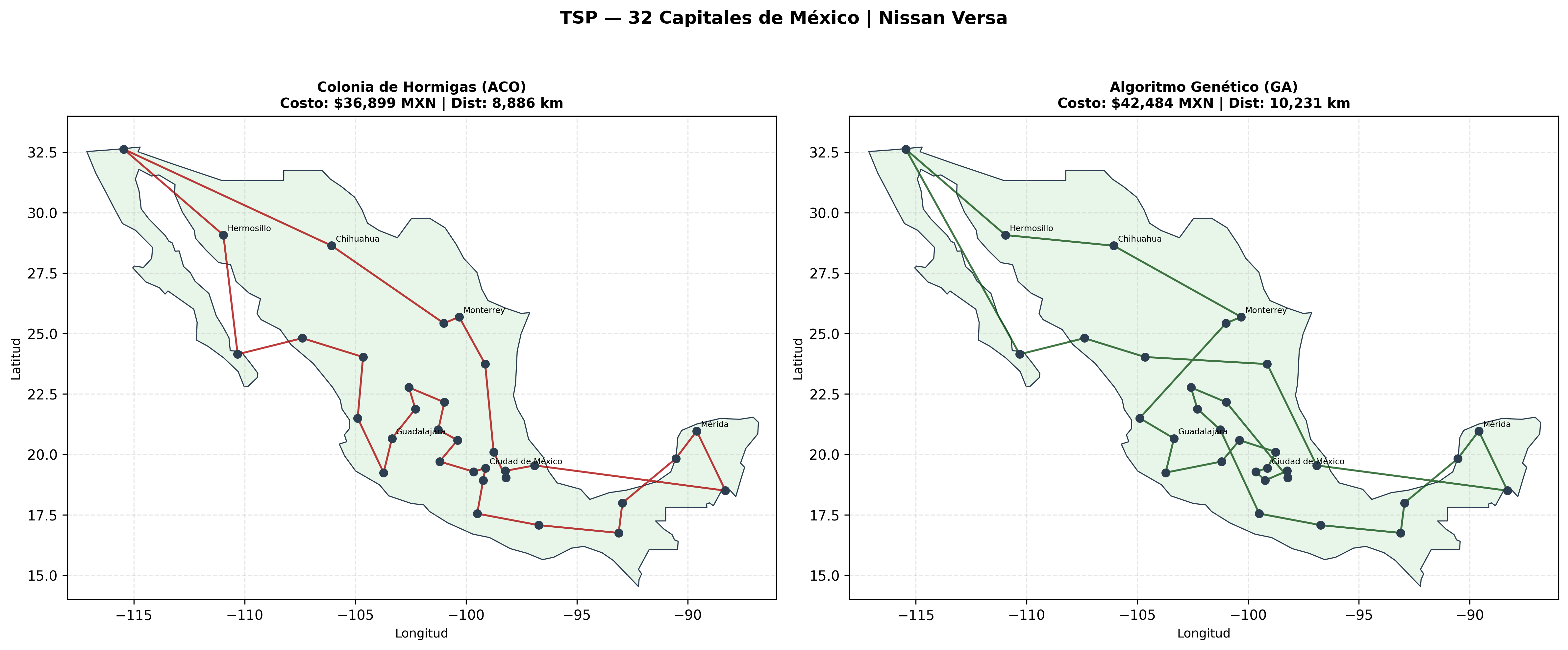 Sin embargo, detrás de esta simplicidad se esconde el Problema del Vendedor Viajero (TSP), un enigma de clase NP-hard. Con 32 ciudades, existen aproximadamente \(2.6 \times 10^{35}\) rutas posibles. Si intentáramos resolverlo por fuerza bruta probando una ruta por segundo, tardaríamos más que la edad actual del universo. Por ello, en esta etapa del proyecto, modelamos el costo operativo real de un vendedor en las carreteras mexicanas y desplegamos dos potentes metaheurísticas para hallar la solución óptima: Colonias de Hormigas (ACO) y Algoritmos Genéticos (GA).