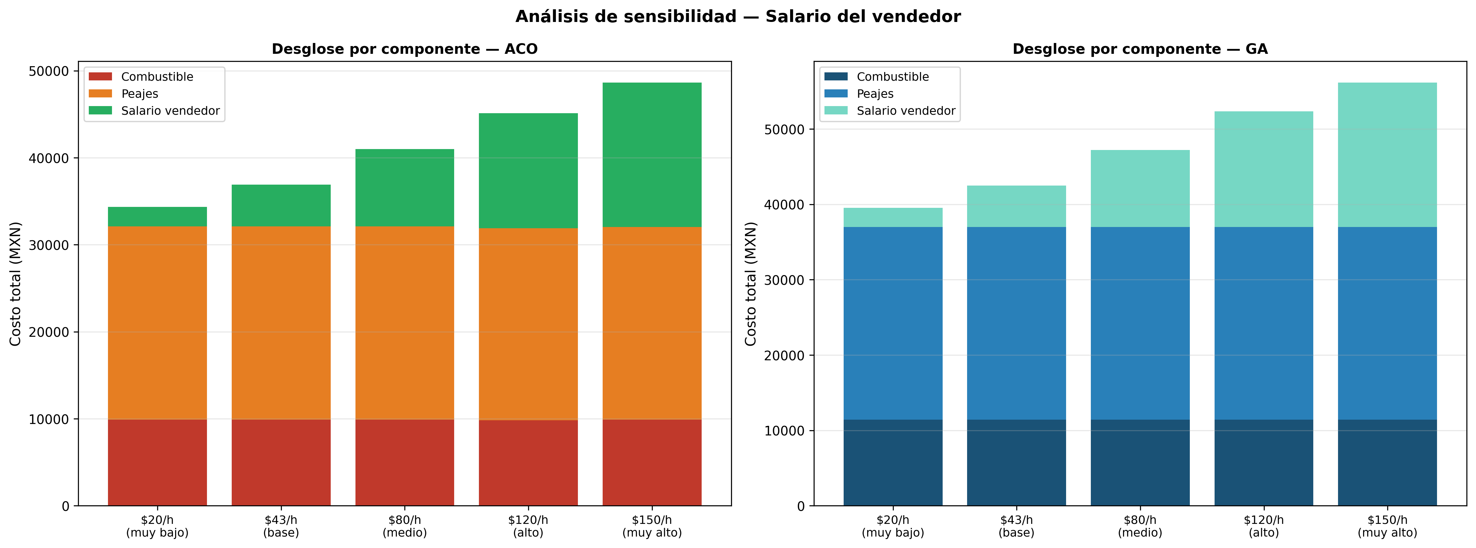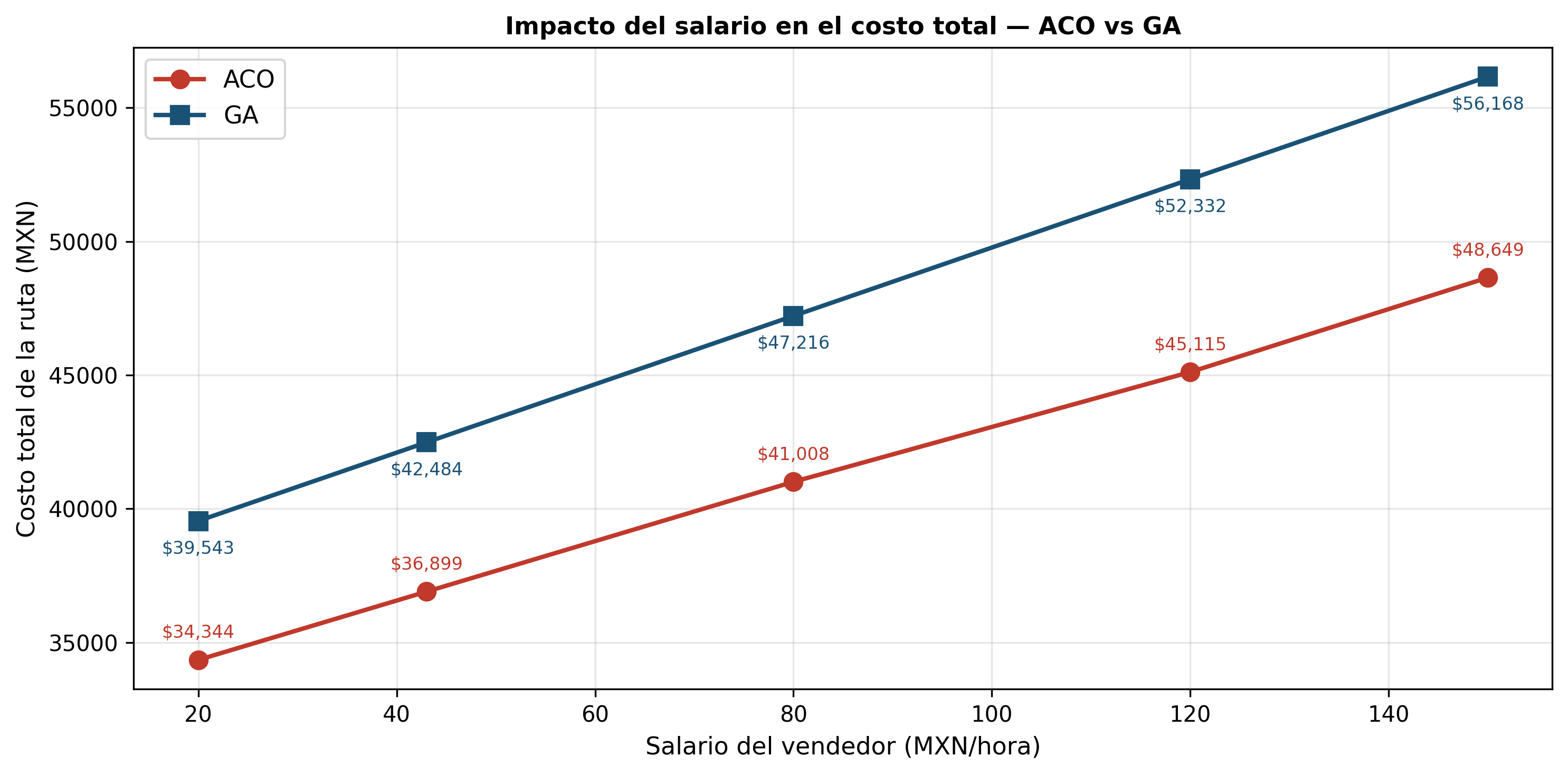¿Qué sucede si el sueldo del vendedor sube? ¿Cambiaría la ruta para priorizar la velocidad sobre la distancia? Realizamos cinco simulaciones variando el salario por hora para observar la flexibilidad de los algoritmos.